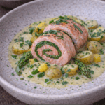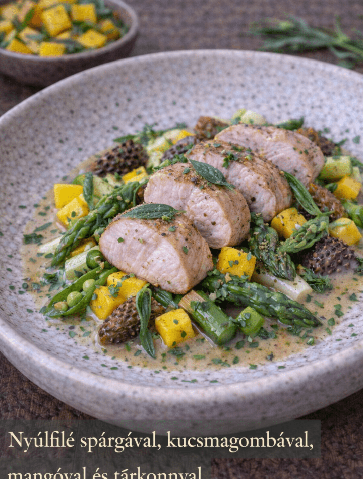 Nyúlfilé spárgával, kucsmagombával, mangóval és tárkonnyal