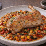 Maga a lecsószusi tehát több különböző ötletem és elgondolásom szüleménye. Algalap helyett zöld paradicsomból és zöld kaliforniai paprikából készítettem zöldségbőrt. Erre került a rizs, melyet a szusiknál megszokott ecetmennyiségnél kevesebb ecettel ízesítettem, hogy ne nyomja el a töltelék ízét. Cserébe viszont a felhasznált paradicsom és paprika hulladékaiból, mint pl. csumákból, magokból vagy héjakból egy lecsóalaplevet főztem és ezzel ízesítettem a rizst. Töltelékként sült tv paprikát és félig aszalt paradicsomot tettem a szusiba, melyeket egy kevés sült fokhagymakrémmel kentem meg.