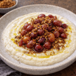 Persze itt is minden hagyományos elemnek találtam egy megfelelő párt. Rumba áztatott mazsola helyett pl. Bloody Mary által megihletve szárított paradicsomot tettem ginbe. Narancs- ill. citromhéj, valamint vanília helyett finom apróra vágott friss zöld fűszerekkel ízesítettem. Tej helyett kecsketejből készült kefirt raktam a tésztába, melyet – akárcsak a friss és öreg kecskesajtokat – a piaci kecskesajtosomnál szereztem be. Magára a kész kecskesajtos császármorzsára porcukor helyett frissen reszelt kecskesajtot szórtam, almapüré helyett pedig paprikamártással és tárkonyolajjal locsoltam meg.
