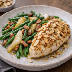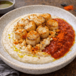 A rizottó készítésének egyik utolsó lépéseként (mantecato) vajat szoktak elkavarni a rizsben. Ennél a tejberizsnél olyan ötletem volt, hogy a vajat kiválthatnám fehér csokira. Rendkívül jól működött a fehér csoki, azaz ezentúl minden tejberizsbe fogok tenni némi fehér csokit vagy kakaóvajat. A tejberizst frissen reszelt tonkababbal ízesítettem, valamint tálaláskor tejjel elkavart és ezáltal felhígított mandulakrémmel locsoltam meg. Ropogós elemként pörkölt mandulalapkákkal szórtam meg a tányért, majd utolsó simításként a friss abruzzoi olívaolajjal meglocsolva vittem bele a füves aromákat.